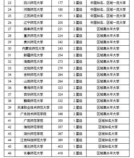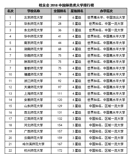 报告显示,在最新艾瑞深中国校友会网2018中国大学综合实力排行榜700强中,北京师范大学(分数线,专业设置)雄居校友会2018中国师范类大学排行榜榜首,荣膺2018中国六星级大学,跻身世界高水平大学、中国顶尖大学行列。华东师范大学第2,东北师范大学第3,华中师范大学第4,南京师范大学第5,湖南师范大学第6,华南师范大学、陕西师范大学、首都师范大学并列第7,福建师范大学第10。