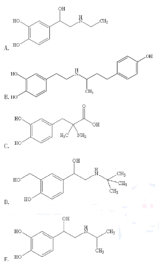 8.具有儿茶酚胺结构的药物极易被儿茶酚-0-甲基转移酶(cOMT)代谢发生反应。下列药物中不发生COMT代谢反应的是( D )
